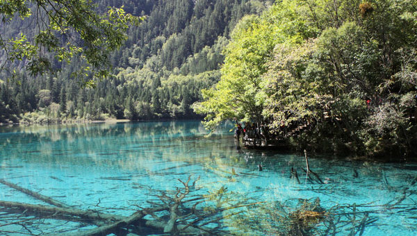 在沟口乘坐观光车时一定要选择坐在车的左手边,这样的话你会通过车窗看到许多美景,盆景滩、芦苇海、双龙海、火花海、卧龙海、树正群海……(我们只有一天的时间,这些景色下车去看的可能性很低,坐在右手边的话就只能听车上导游给你简单说一说,但你什么都看不到。)
